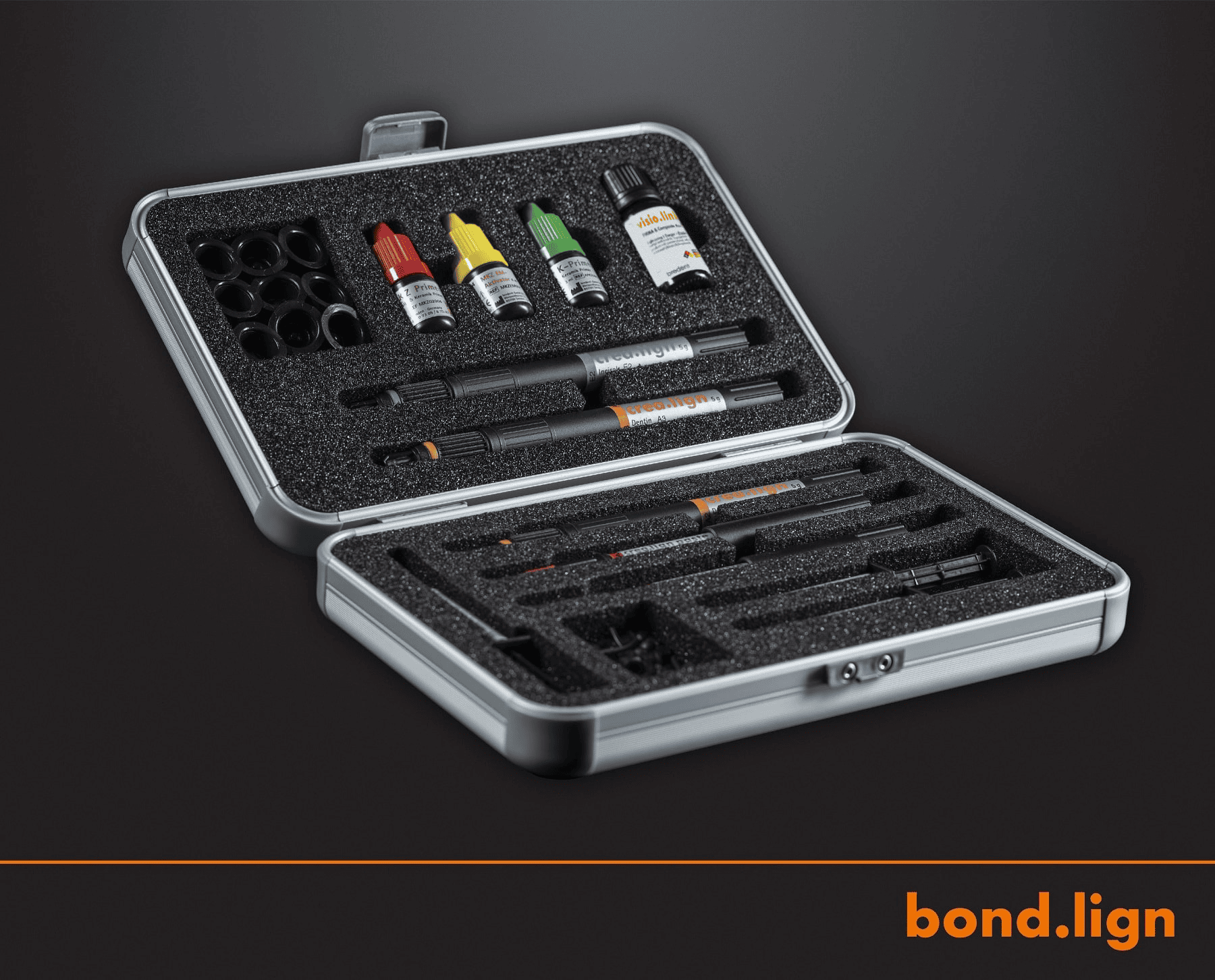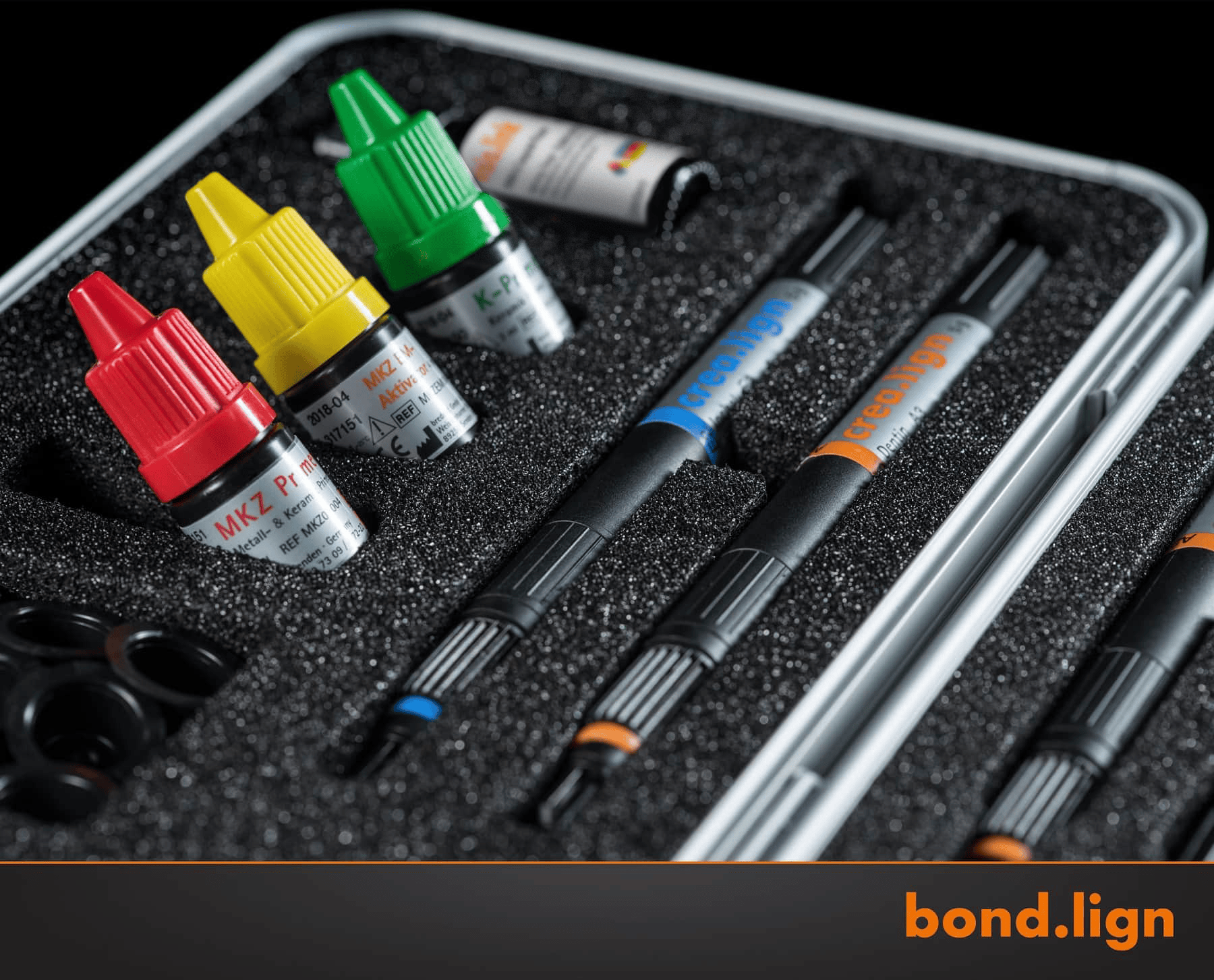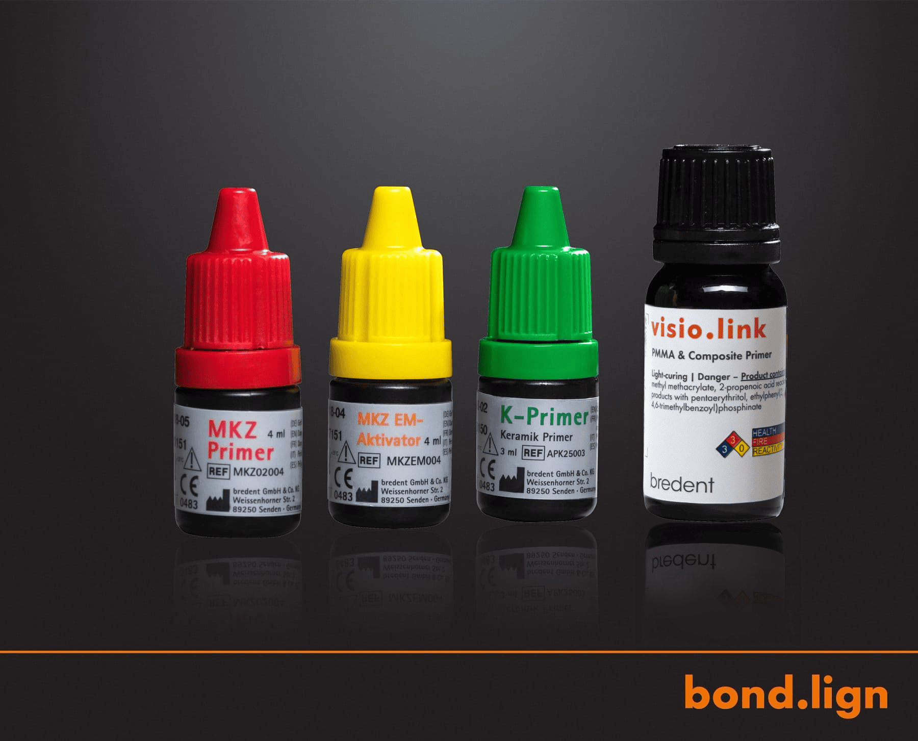 Beste Verbundwerte zwischen novo.lign® Verblendschalen und Gerüstmaterial werden mithilfe der Primer & Bonder der bond.lign Linie erzielt (siehe Voss-Scher-Test der Universität Jena auf Seite 12/13 des novo.lign® Prospekts REF 0099390D).